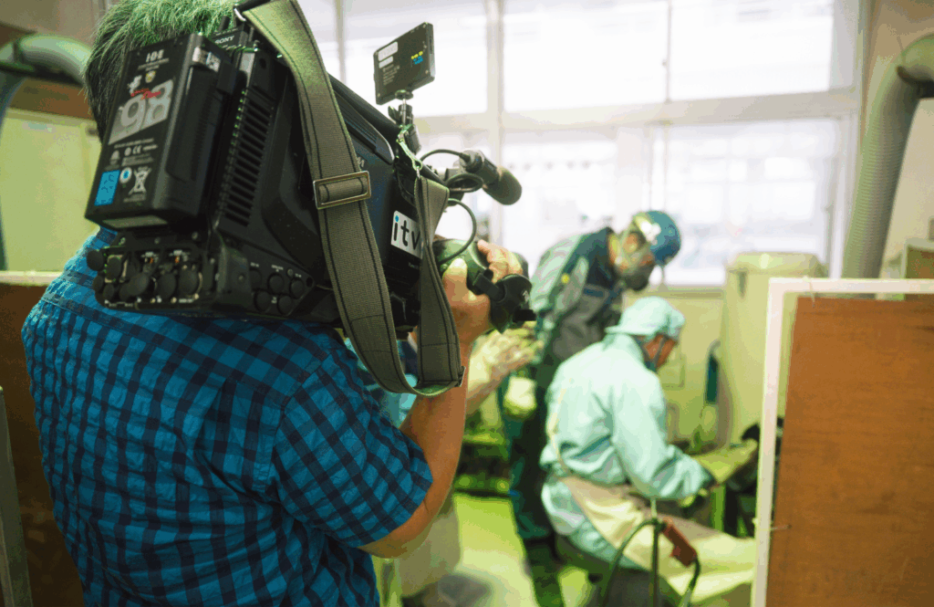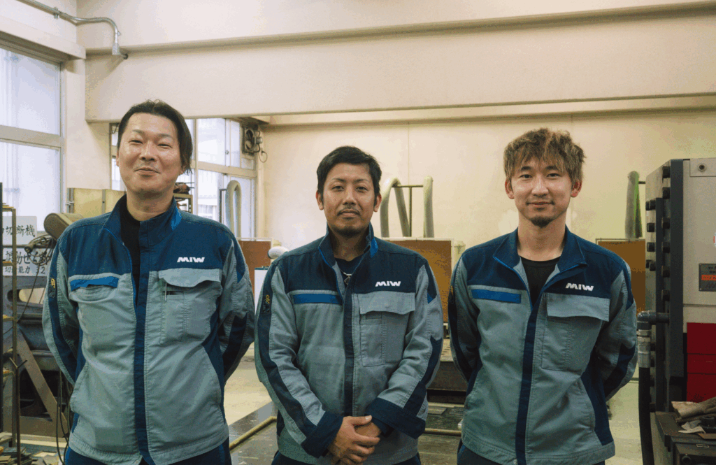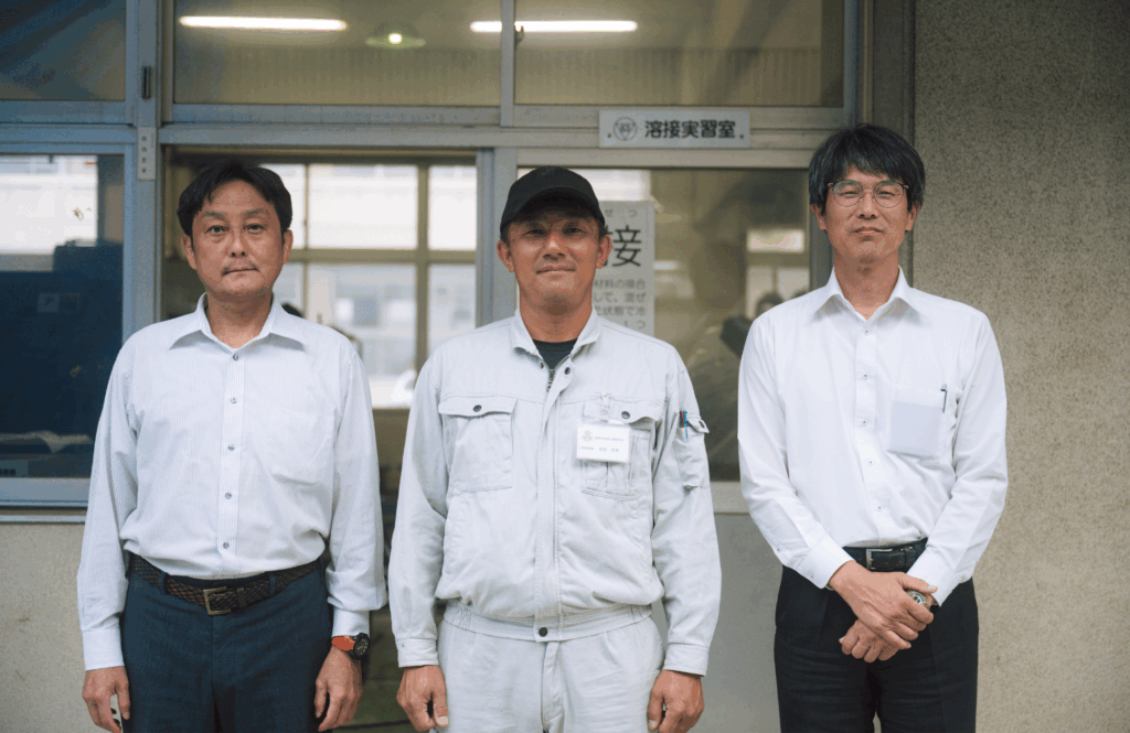 〈 講師として参加したミヨシの溶接工。左から西条事業所 製造課 十河さん・藤本さん、本社製造課 髙橋さん 〉