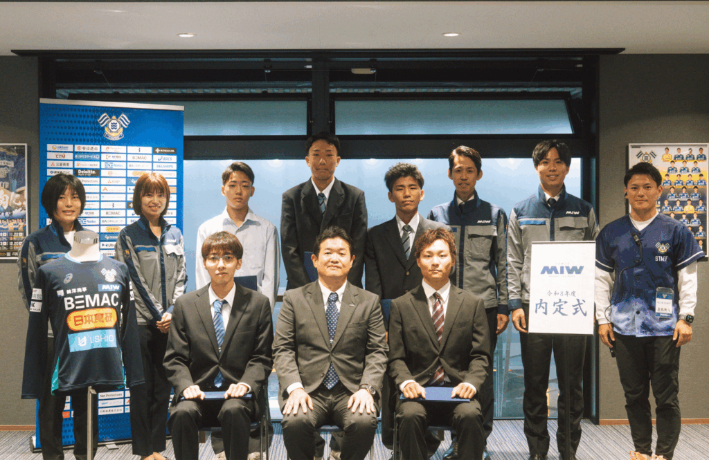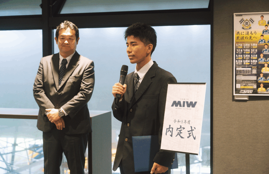 「他の企業ではあまりない、プロサッカーチーム協力のもと行われた内定式は、特別な思い出になりました。三好鉄工所への入社への期待が膨らんだ1日になりました!」