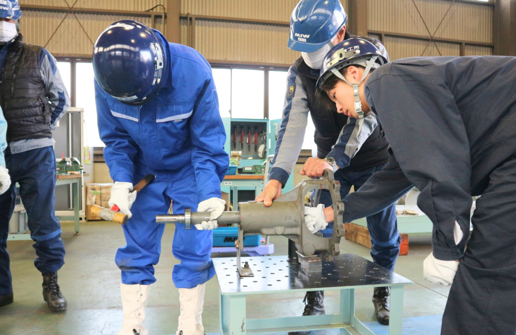 技術部で図面の読み方を学んだあと、第一工事部で回転機の仕上業務を体験。